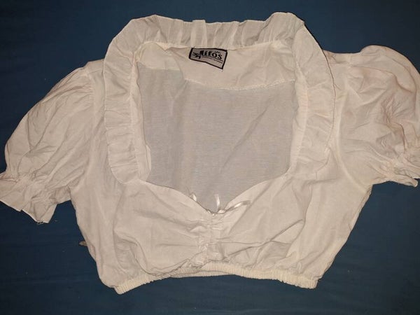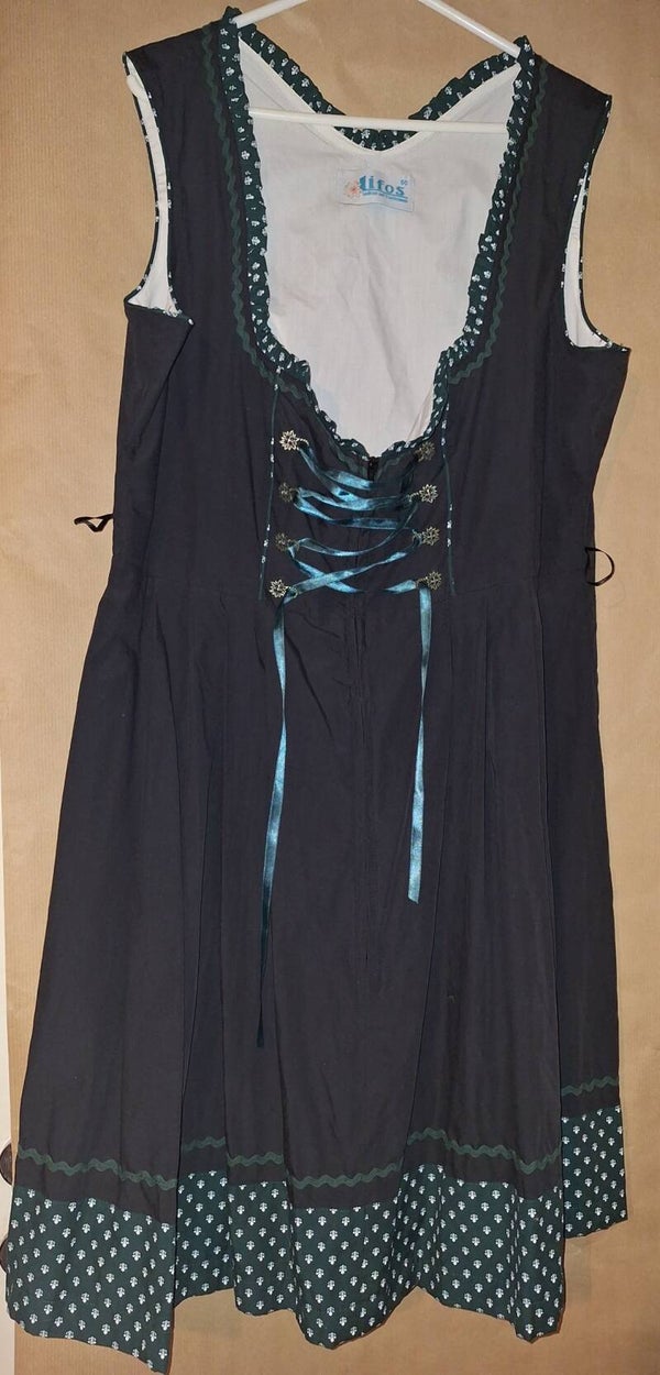 Das Dirndl beinhaltet Kleid, Bluse und Schürze und misst in der Taille einfach gemessen 50cm und ist 104cm lang. Das Dirndl hat eine eingenähte Tasche im im Kleid, was sehr praktisch. Zusätzlich noch 2 Schlaufen für die Schürzenbänder.