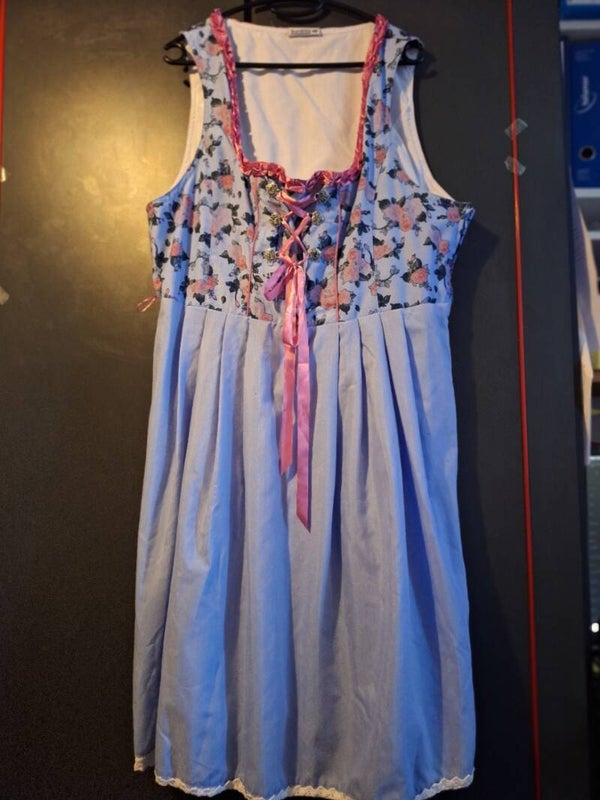 Das Dirndl misst in der Taille einfach 50 cm und in der Länge cirka 102cm, hat einen sseitlichen Reissverschluss und eine eingenähte Tasche. Es ist aus 100% Polyester. Die Schürze hat aus Stoff draufgenähte Blumen (Fotos7+8) und in der Schürze ein eingesticktes Blumenmuster (Foto9)