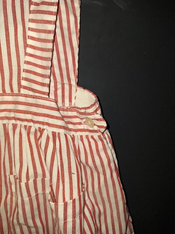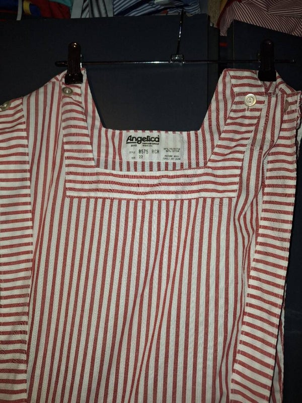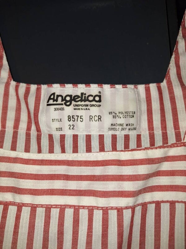 Krankenschwester , Nurse Uniform mit rotweissen Streifen einmal in der Achsel links mit zwei Knöpfen zu öffnen, rechte Seite sind zwei Knöpfe angenäht zur zier nicht zum öffnen.