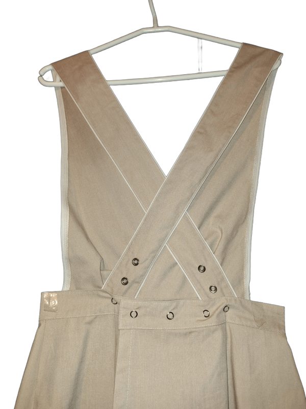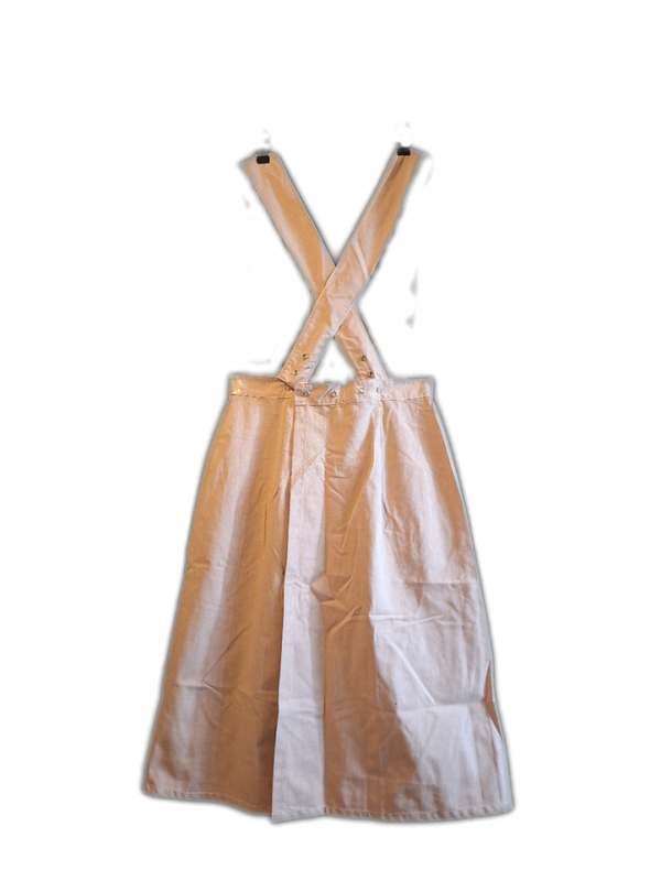 Vermutlich nicht gebrauchte hellbraune Rockschürze, verstellbar in Grösse 36-40, sowie auch die über Kreuz im Rücken Latzbänder die ebenfalls mit druckknöpfen verstellbar sind in der Länge.