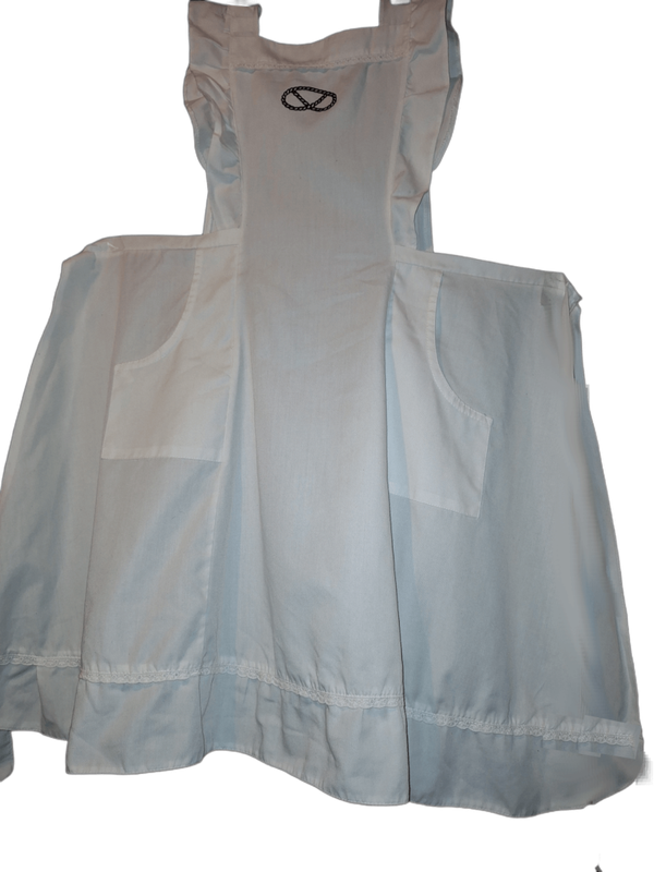 Die Schürze hat ein Brezel im Latz und Rüschen und Volants.