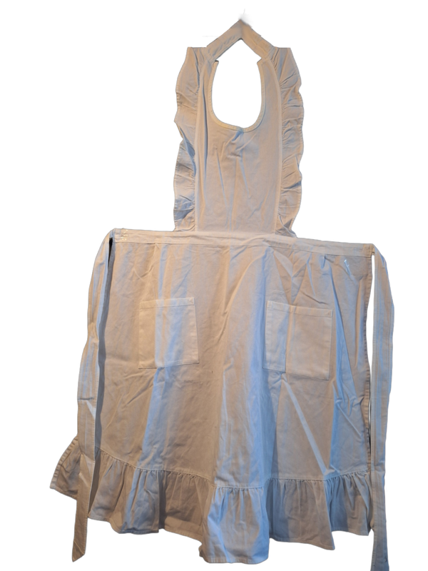 Besonders charmant: Die dekorativen Rüschen entlang der Kanten verleihen der Schürze eine verspielte Note – ideal für den Alltag in Küche, Atelier oder Garten.