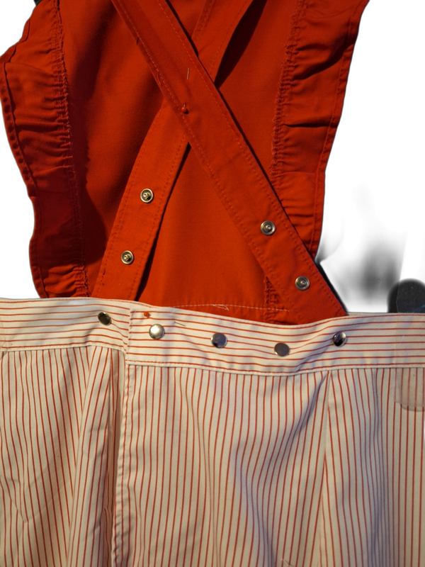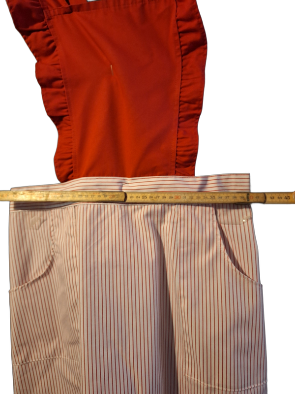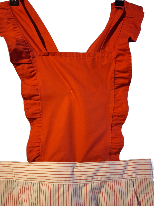 iese charmante Überwurfschürze kombiniert ein leuchtend rotes Oberteil mit verspielten Rüschen-Trägern und einem gestreiften Rockteil in Weiß und Rot. Der rote Latzteil mit überkreuzten, verstellbaren Trägern und Druckknöpfen sorgt für optimalen Halt. druckknöpfe sorgen auch für die exakte Taillenweite.