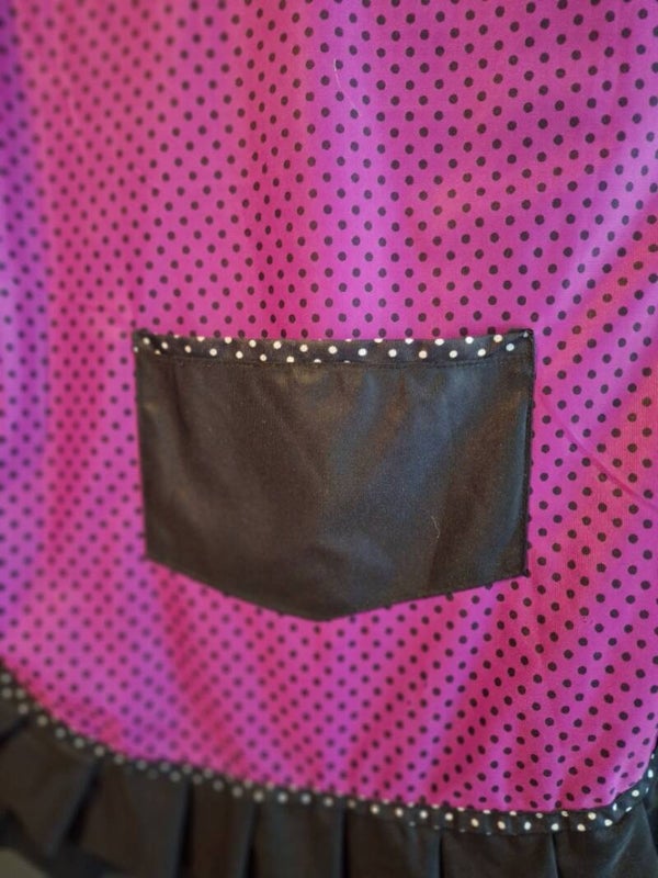 praktische leichte neuere Sommerschürze, vermutlich Dederon oder ähnlicher leichter Stoff . die Schürze kann man seitlich binden und hat vorne noch eine Tasche. Für grössen mittlerer Statur.