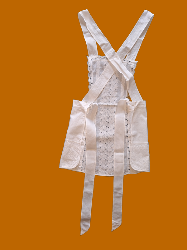 Die Schürze ist kurz geschnitten und endet deutlich oberhalb des Knies – ideal für Bewegungsfreiheit und einen frischen, praktischen Look. Zwei grosse Taschen auf der Vorderseite bieten Stauraum für Utensilien. Der Spitzenbesatz entlang der Träger und Taschen verleiht dem Modell eine verspielte, nostalgische Note.