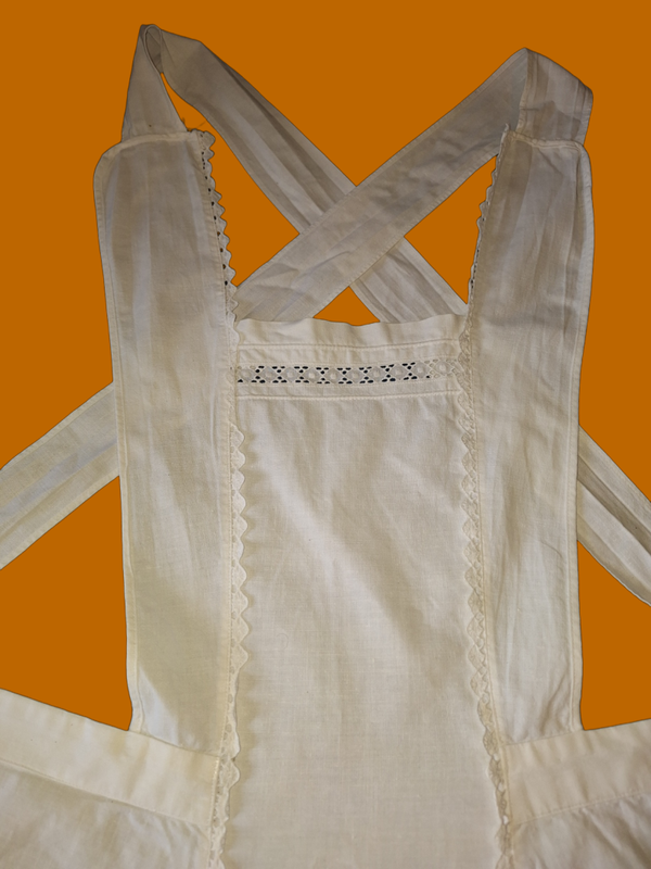 Diese charmante Zofenschürze aus leichtem Baumwollstoff ist für Grössen von ca. 36 bis 40 geeignet – eventuell auch etwas darüber, je nach Bindung. Die Träger sind ursprünglich für eine Kreuzbindung im Rücken konzipiert, können aber bei Bedarf auch im Nacken gebunden werden, wodurch die Passform flexibel bleibt.