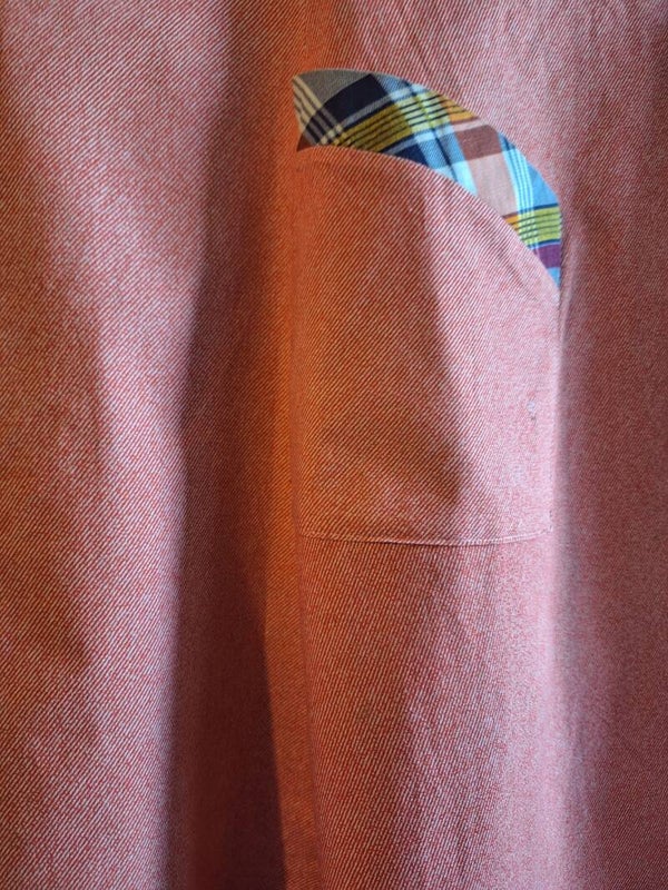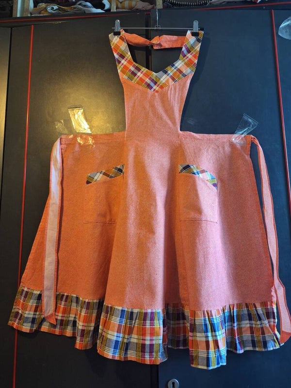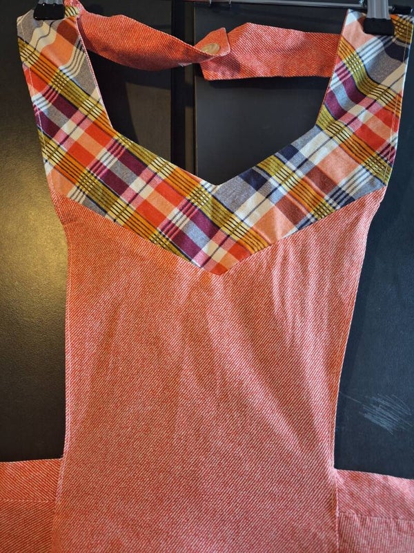 Einfache Stoff Küchenschürze mit 2 Taschen, universelle Grösse, praktisch ungebraucht, im nacken geknöpft. Die Schürze ist cirka 90cm lang