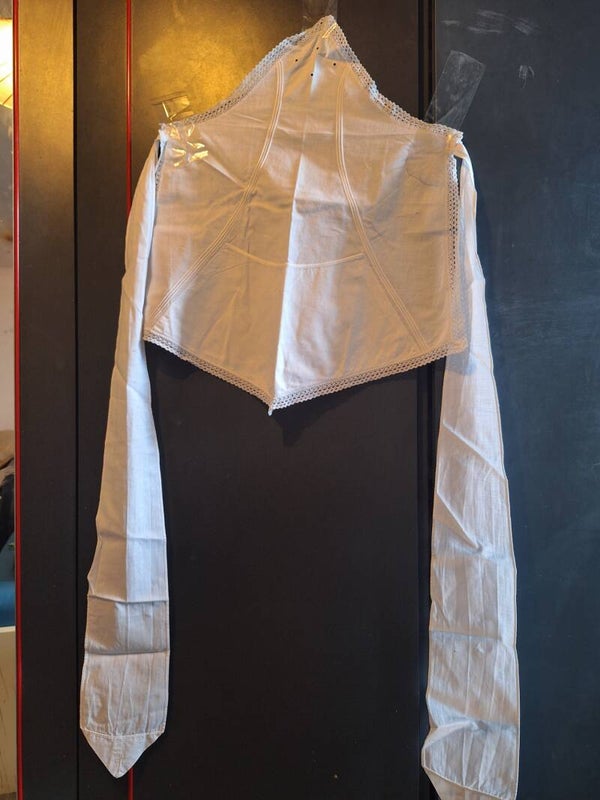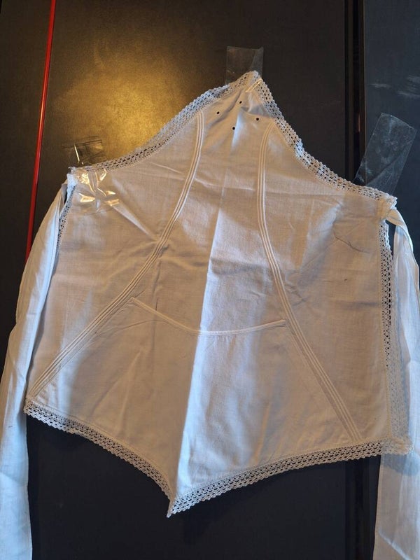 Ob die Schürze bereits als antik gilt, lässt sich nicht eindeutig sagen – doch die Befestigungsweise und der Schnitt deuten auf ein älteres, traditionelles Modell hin. Der Zustand ist gepflegt und vollständig intakt, ideal für Kostüm, Haushalt oder Sammlung.