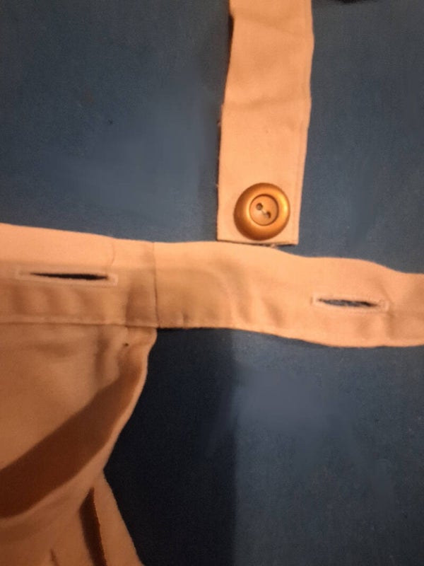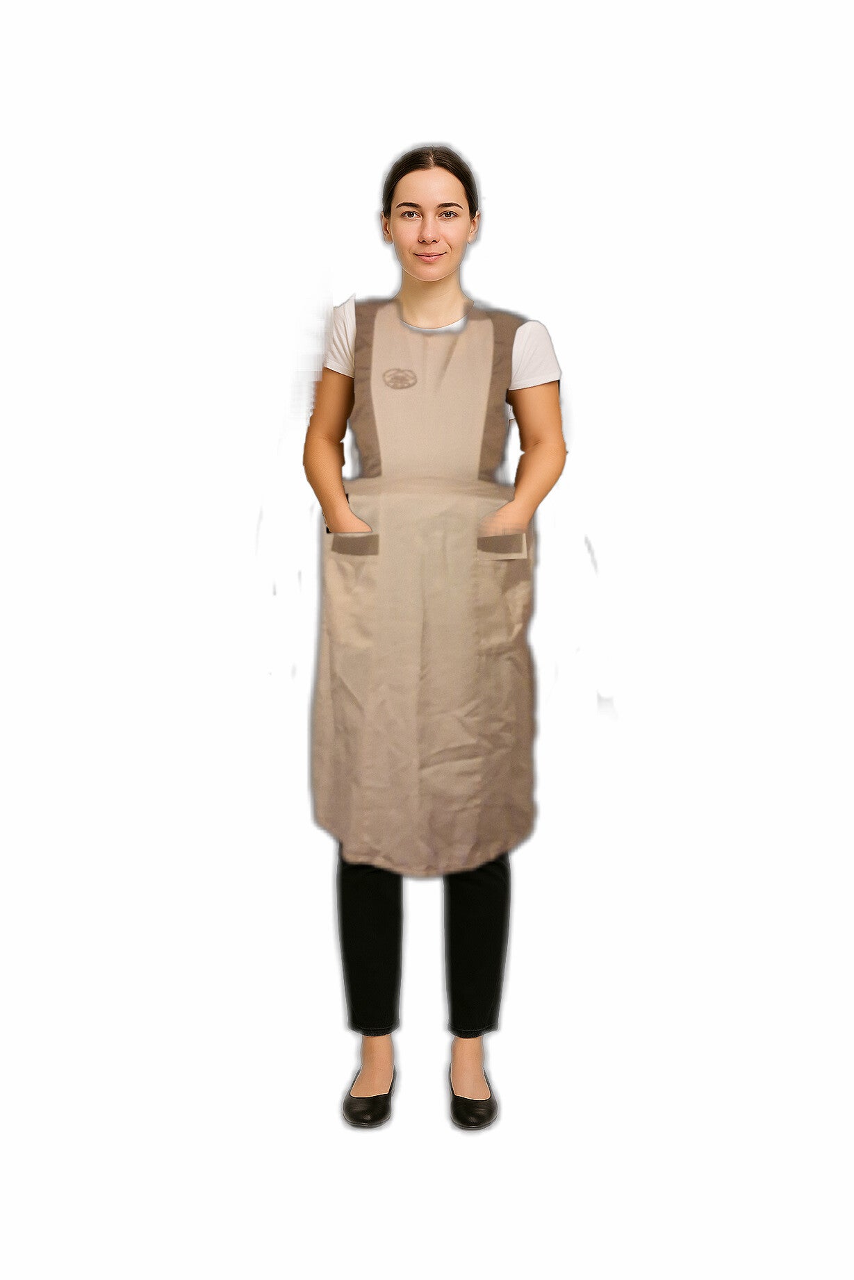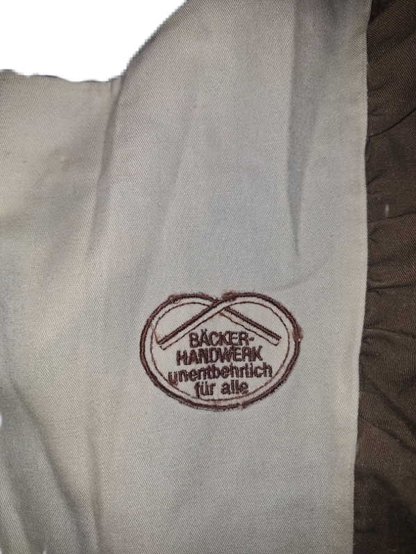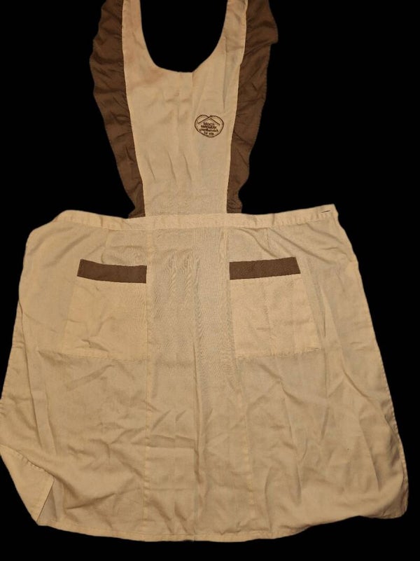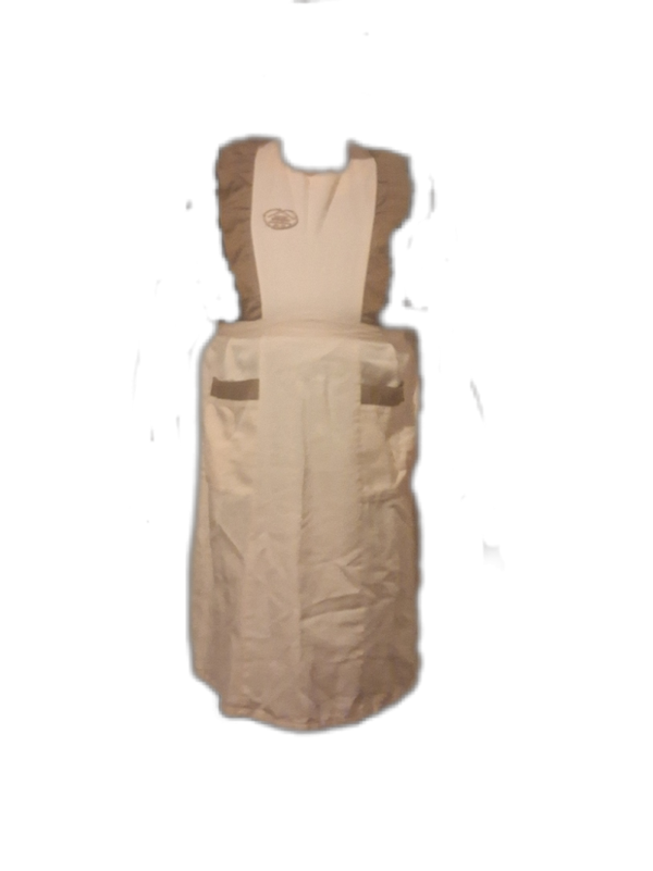 SChürze für einen Bäckerei Betrieb oder ähnlichen Betrieb. Kann natürlich auch privat genutzt werden. Eine Schürze für den Handwerksbetrieb wie heute Schürzen nicht mehr gemacht werden. Die Schürze ist in Hellbraun mit dunkelbraunen Rüschen an den Seiten vom Latz und hat zwei Taschen. Die Schürze ist cirka 100 cm lang und im Rücken über Kreuz zu knöpfen hat dazu zwei Schlitze in der Taille (siehe Foto 5)